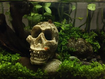 Iwagumi mini water garden aquascape with human and animal skull ornament
