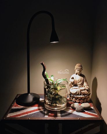 Small water garden with light on an office table sitting between a Buddha statue and pothos vase
